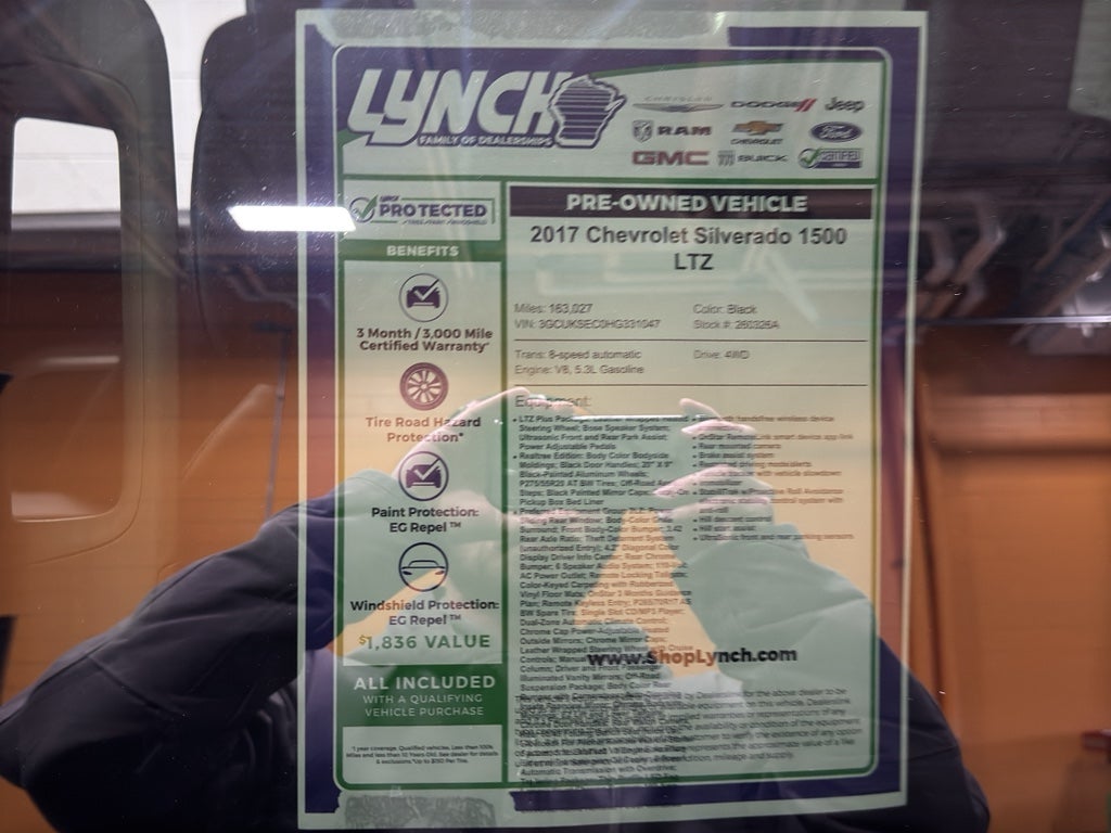 2017 Chevrolet Silverado 1500 LTZ 4WD — powerful V8, 5.3L engine, and premium features make this truck the best value in Burlington, WI. Built for work and weekend adventures, the LTZ blends muscular performance with refined comfort. The 5.3L V8 delivers confident towing and passing power while the 4WD system handles Wisconsin roads and trailheads with ease. This Chevrolet Silverado comes loaded: Hands Free Bluetooth® keeps calls and music connected, Steering Wheel Audio Controls put convenience at your fingertips, and the BOSE Stereo provides premium sound for every drive.