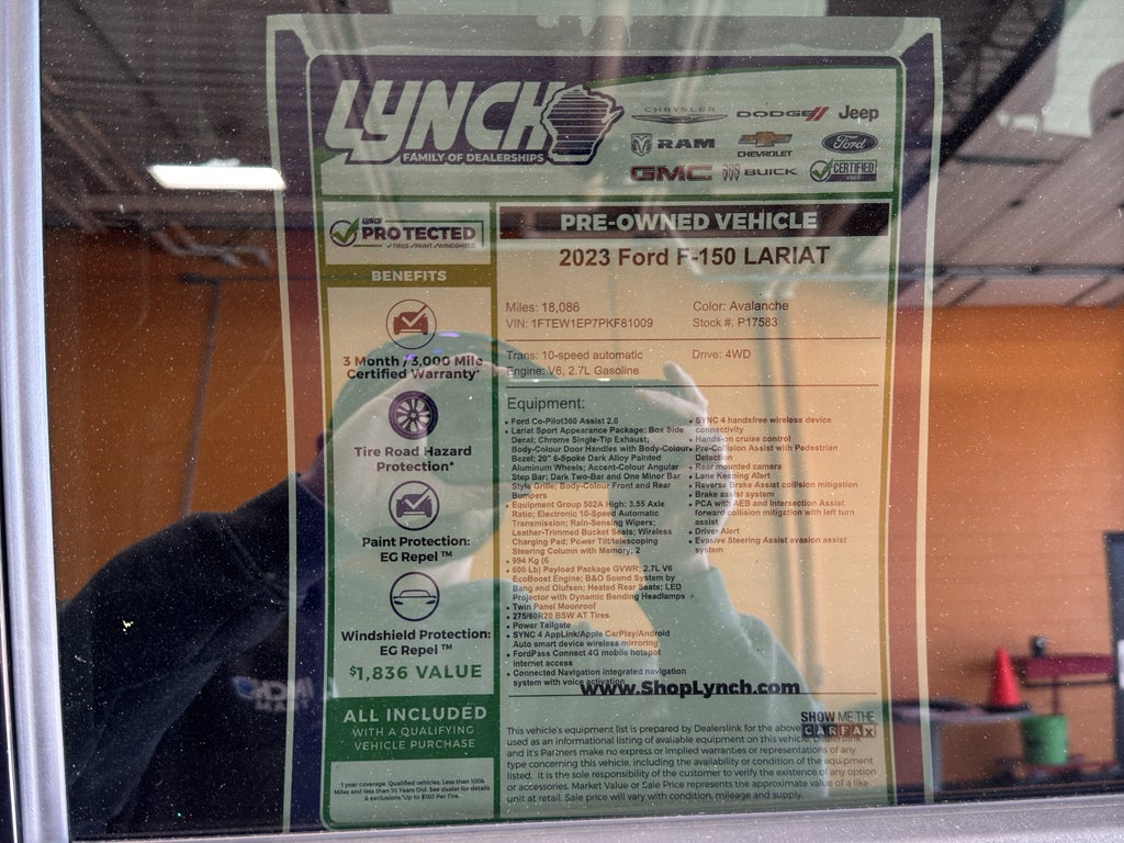 2023 Ford F-150 LARIAT - low mileage, premium capability and comfort meet in this versatile pickup located in Burlington, WI. With just 18,086 miles on the odometer, this well-maintained Ford F-150 features a potent 2.7L V6 gasoline engine and 4WD for confident towing and off-road performance. The LARIAT trim adds upscale touches and advanced tech designed for daily driving and worksite demands.