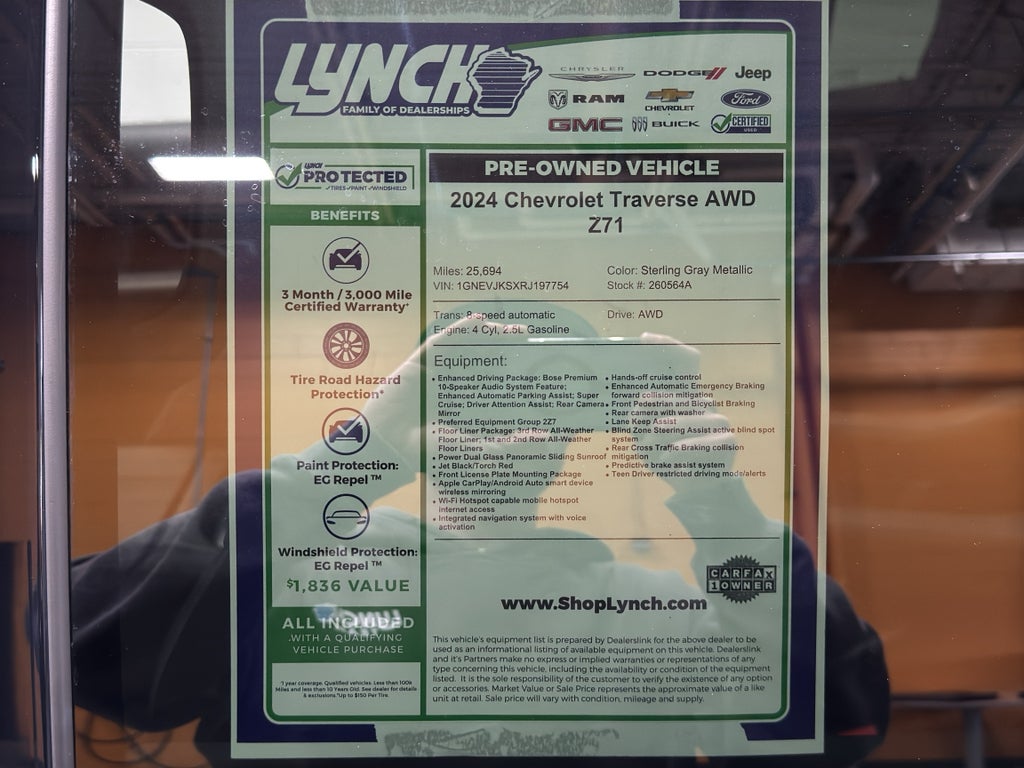 The leather seats in this unit are a must for buyers looking for comfort, durability, and style. This vehicle is a certified CARFAX 1-owner. This 2024 Chevrolet Traverse features a high end BOSE stereo system. The vehicle is pure luxury with a heated steering wheel. This Chevrolet Traverse offers Android Auto for seamless smartphone integration. This vehicle stays safely in its lane with Lane Keep Assist. The installed navigation system will keep you on the right path. This model features a hands-free Bluetooth® phone system. This 1/2 ton suv has auto-adjust speed for safe following. Apple CarPlay: Seamless smartphone integration for it - stay connected and entertained on the go! See what's behind you with the back up camera on this Chevrolet Traverse. Start the vehicle from inside with remote start. The vehicle is equipped with all wheel drive. With the keyless entry system on this Chevrolet Traverse you can pop the trunk without dropping your bags from the store.