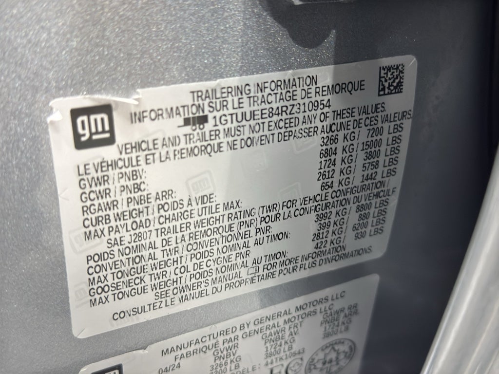 AT4 Premium Package. Preferred Equipment Group 4SB: Trailer Side Blind Zone Alert; Perforated Leather Front Seat Trim; 3.23 Rear Axle Ratio; Ultrasonic Front and Rear Park Assist; Trailer Camera Provisions; Electric Rear-Window Defogger; Theft Deterrent System (unauthorized Entry); Black Chrome Header and Grille Insert Bars; Front Rain-Sensing Wipers; Heavy-Duty Air Filter; Skid Plates; 120-Volt Interior Power Outlet; Wireless Charging; Front Bucket Seats; Front Premium Floor Liners with Removable Carpet Insert; 10-Speed Automatic Transmission; Colour-Keyed Carpeting Floor Covering; OnStar and GMC Connected Services Capable; Heated 2nd Row Outboard Seats; Power Front Passenger Windows with Express Up/down; Power Rear Windows with Express Dow