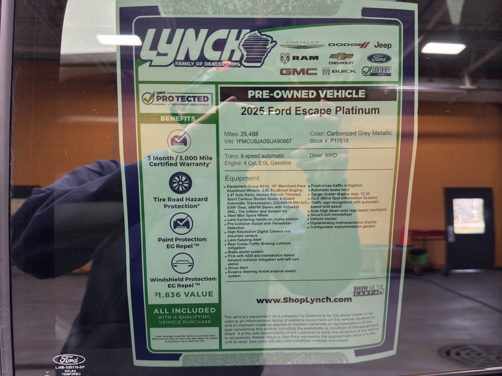 Explore this exceptional 2025 Ford Escape Platinum AWD, located in Burlington, WI — a stunning blend of performance, comfort, and technology with only 25,488 miles. Powered by a responsive 4-cylinder 2.0L gasoline engine and advanced all-wheel drive, this Ford Escape Platinum delivers confident handling and efficient highway cruising while offering the premium features you expect in a top-tier compact SUV.